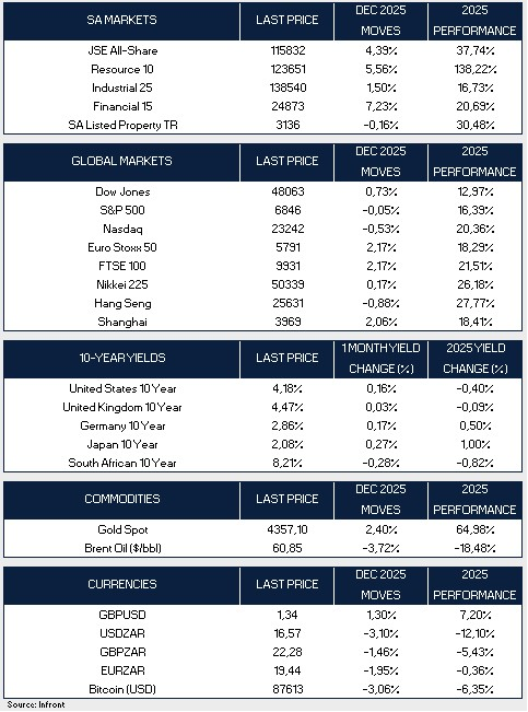 South African markets were standout performers in 2025, underpinned by a powerful recovery in resources and improved global risk sentiment. The JSE All Share Index rose 37.7% for the year, driven by an exceptional 138.2% gain in the Resource 10 index, while financials (+20.7%) and industrials (+16.7%) also delivered solid returns. Listed property rebounded strongly, ending the year up 30.5% despite some volatility in December. Commodities were mixed, with gold emerging as a clear winner (+65.0%) amid persistent geopolitical uncertainty and strong central bank demand, while Brent crude declined sharply (-18.5%) on supply dynamics and slower global growth. The rand strengthened materially over the year, with USD/ZAR appreciating 12.1% in favour of the currency, supported by improved sentiment and a softer U.S. dollar, while South Africa’s 10-year bond yield declined 82 basis points, reflecting easing inflation pressures and improved fiscal and policy credibility.