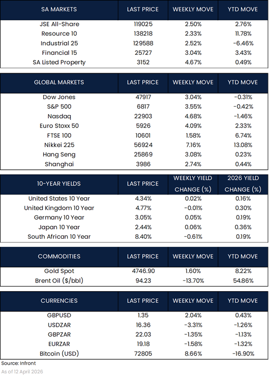 South African markets had a strong week, in line with the broader recovery across emerging markets. The FTSE/JSE All Share Index rose 2.50%, supported by improved global sentiment and renewed investor appetite for risk.