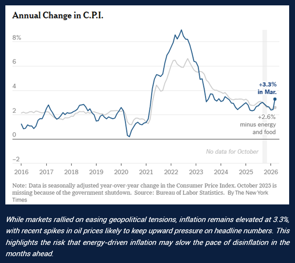 Technology stocks continued to drive performance, particularly those linked to artificial intelligence and semiconductors. Investors remain focused on long-term themes such as compute demand and infrastructure investment, which continue to underpin strong performance in this part of the market. Economic data was more mixed. Inflation picked up slightly, largely due to higher energy prices, while consumer sentiment weakened. This suggests that while markets are responding positively to global developments, underlying pressure on consumers remains.