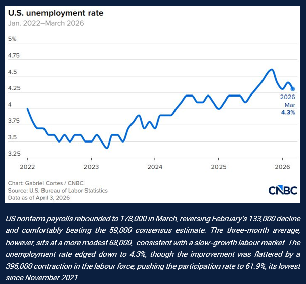 On the labour market, the US added 178,000 jobs in March, well ahead of the 59,000 consensus estimate and the unemployment rate dipped to 4.3%. However, the headline figures masked softer underlying trends: job openings fell to 6.9 million in February from 7.2 million in January, hiring slid to its lowest since 2020, and the labour force shrank by 396,000, with the participation rate dropping to 61.9%, its lowest since November 2021. Economists cautioned the Iran war is making businesses more hesitant to hire, with the full impact likely more visible in the April report. Markets now price virtually no Fed rate move through year-end, with futures pointing to a 77.5% probability of rates on hold.