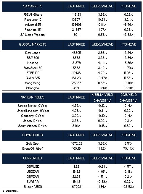 Markets recovered some recent losses, with the FTSE/JSE All Share ending the holiday-shortened week 3.9% higher, buoyed by resource counters. The rand also firmed, gaining over 1% to close at R16.92/$.