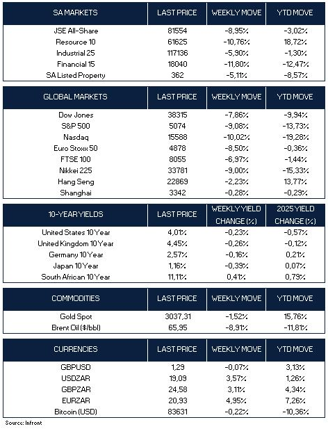 The local market came under significant pressure this week, with the JSE All Share Index falling by 8.95% as all three major sectors recorded losses. By Friday’s close, the rand had weakened to R19.09 against the U.S. dollar.