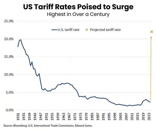 President Trump announced U.S. reciprocal tariff plans that were more aggressive than expected. The new tariffs are estimated to raise the effective tariff rate on U.S. imports from 2.3% in 2024 to between 20% – 25%, the highest in at least 100 years. From 2000 – 2024, the average U.S. tariff rate for all imports was a modest 1.7%. Based on the announced tariffs, the average U.S. tariff rate is expected to jump to between 20% – 25%. In 2024, the U.S. economy imported roughly $3.3 trillion of goods. Assuming an average tariff rate of 20%, this would equate to tariff revenue of roughly $660 billion, or roughly 2.3% of 2024 GDP. Source: Bloomberg, U.S. International Trade Commission, Edward Jones.