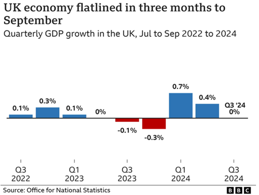 The UK’s quarterly GDP growth held steady at 0% in Q3 2024, signalling a slowdown following modest gains in the first half of the year.