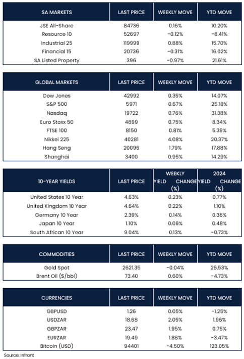 During the week, the JSE All-Share Index posted a modest gain of +0.16%, primarily driven by a 0.88% increase in the industrial sector. The other sectors finished the week slightly lower, with the resource, financial, and property sectors declining by -0.12%, -0.31%, and -0.97%, respectively. By the close of trading on Friday, the rand had depreciated against the U.S. Dollar, trading at R18.68, marking a weekly decline of -2.05%.